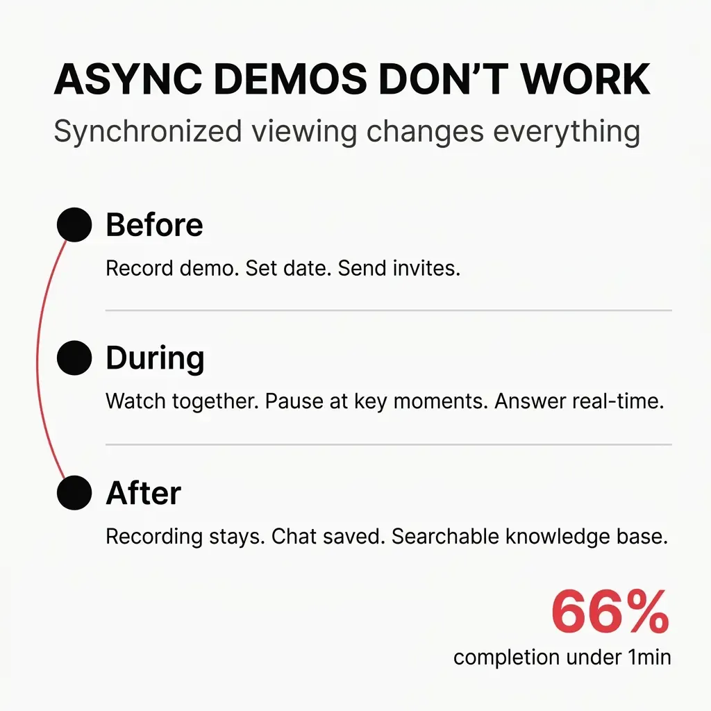 No accountability for attention. Async demos compete with everything else. Slack notifications. Email. That production bug. When you're watching alone, nothing stops you from multitasking or bailing entirely.